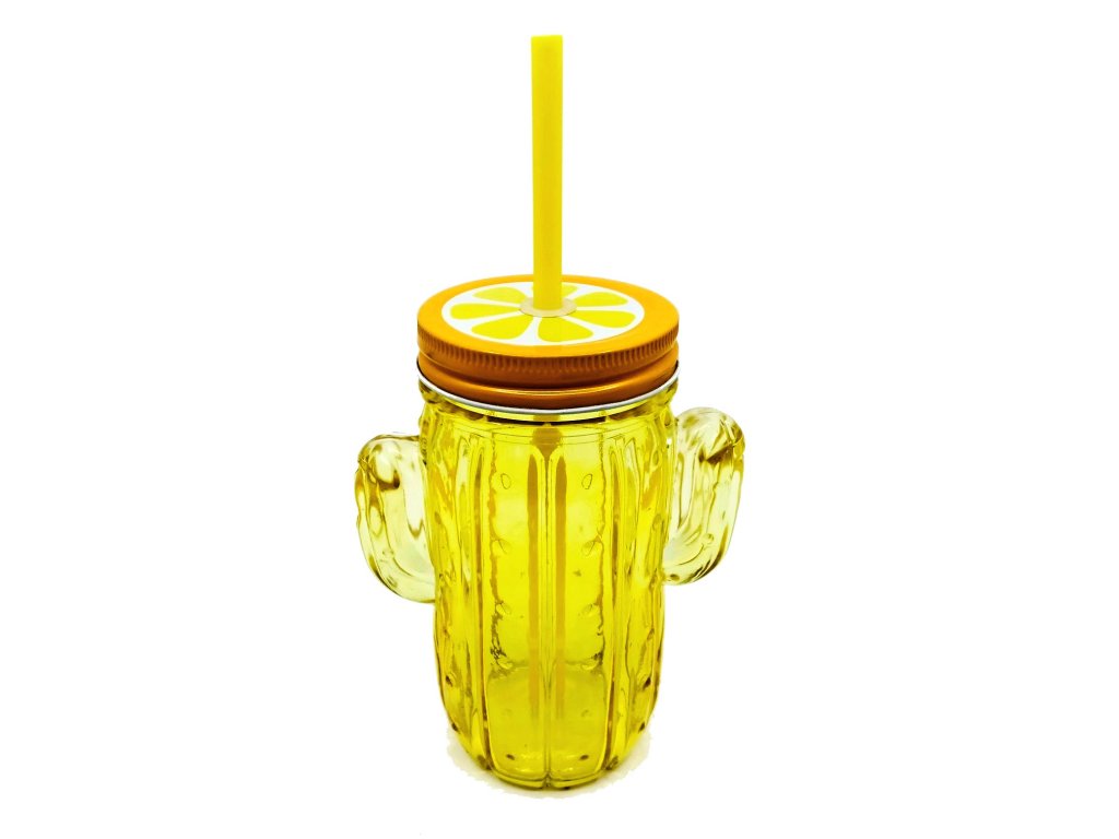 Skleněná láhev s víčkem a brčkem o objemu 470ml. Praktické víčko zabraňuje vylití tekutiny a chrání nápoj před hmyzem.
